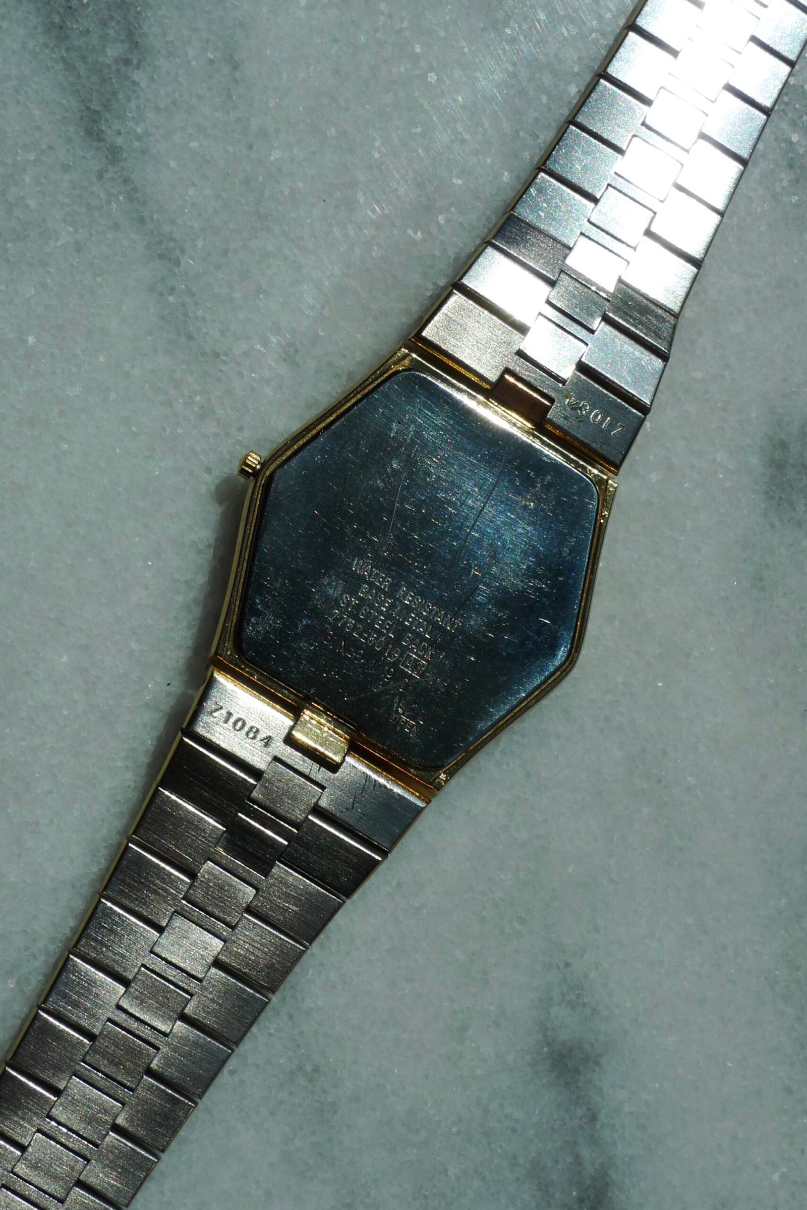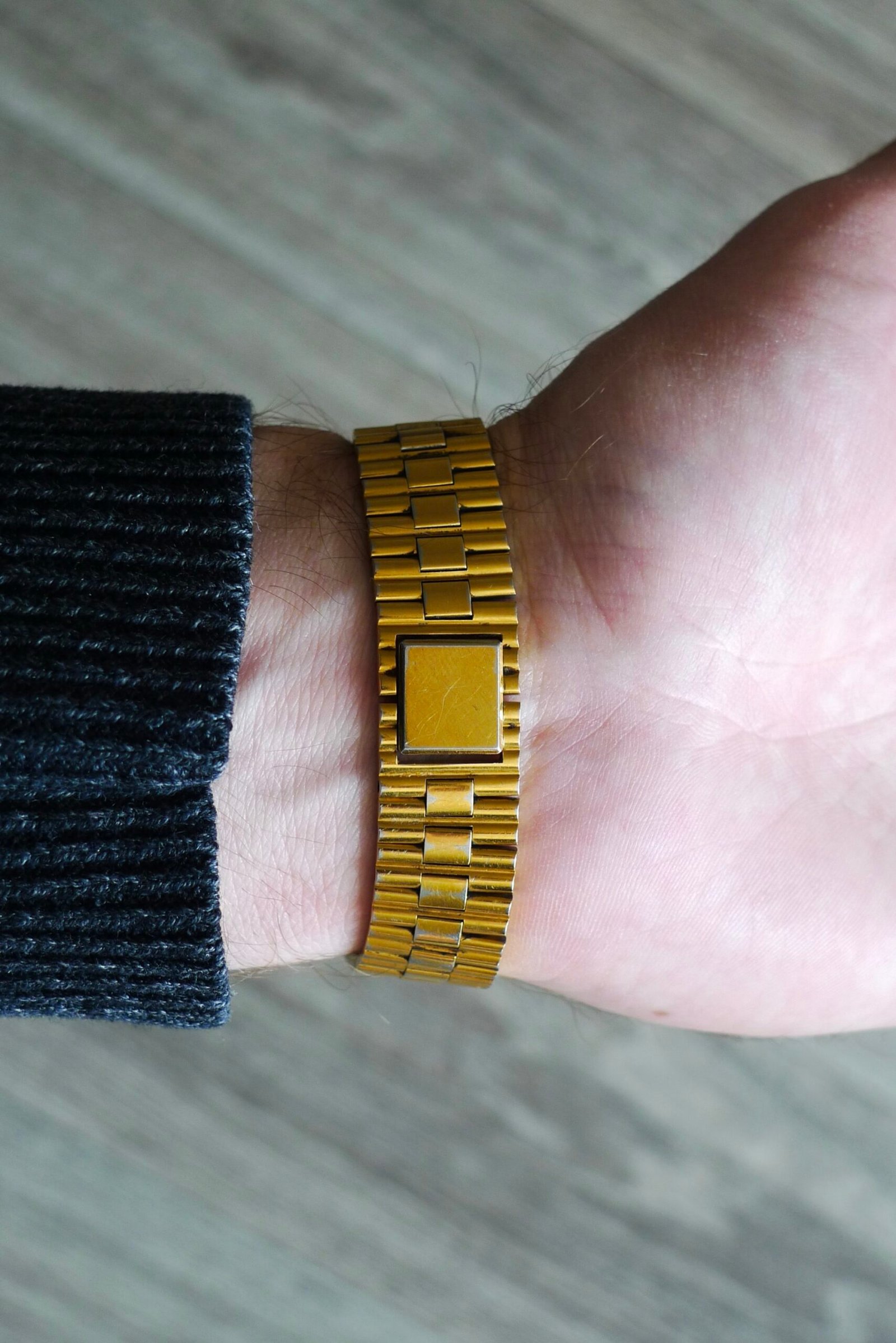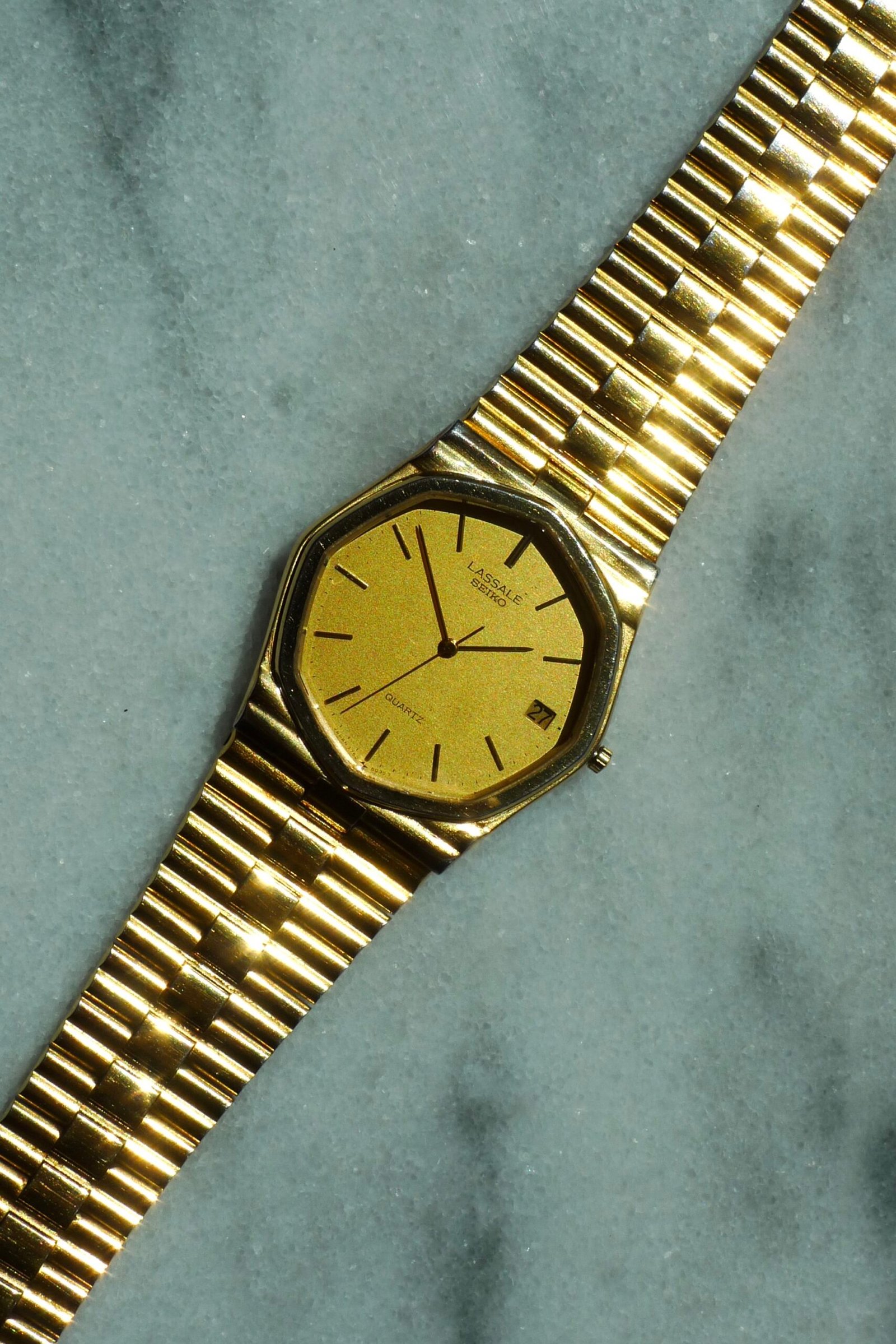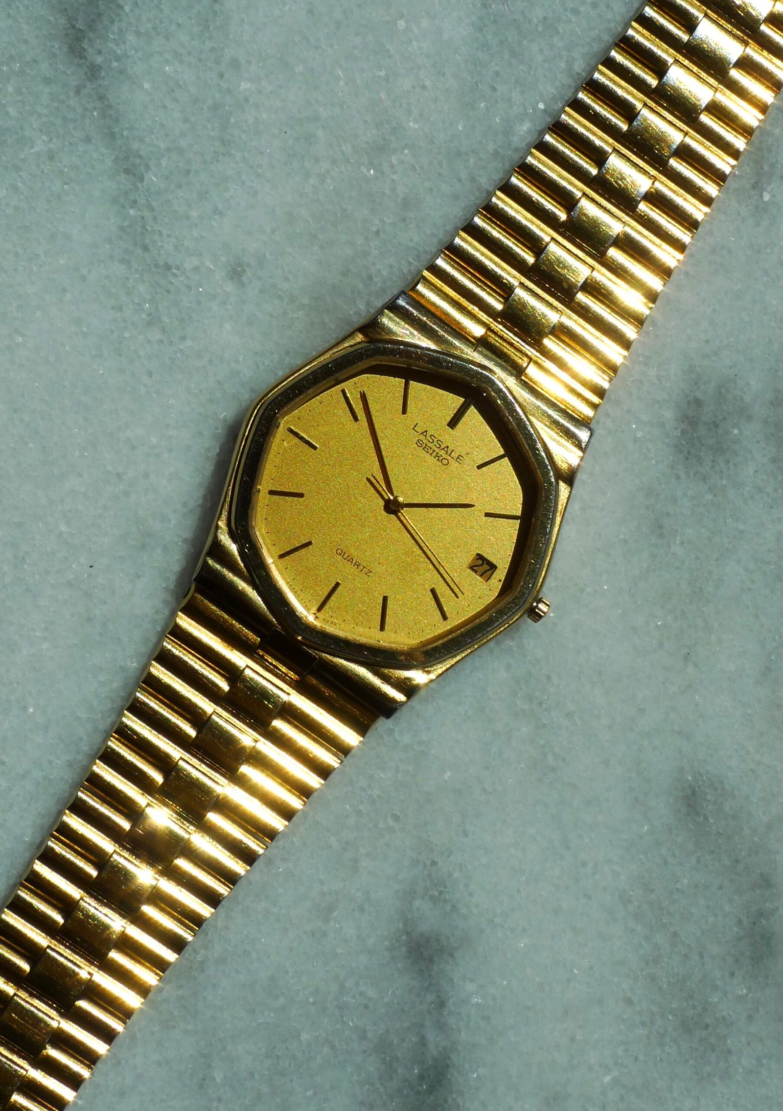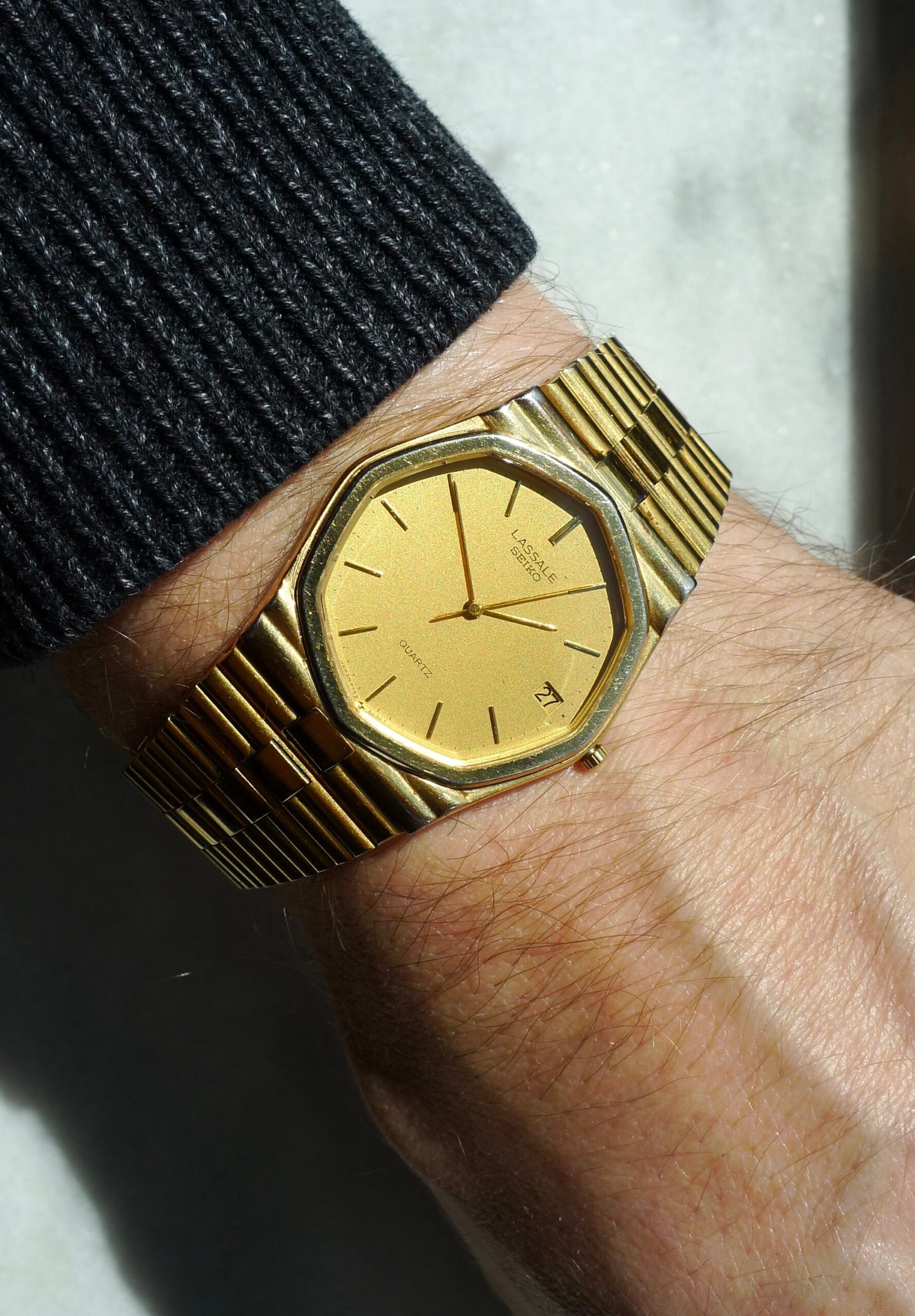 Gold, gold, and gold! Here we have a 1983 Seiko Lassale octagon, coming in at 32mm with a 22-15mm tapered integrated bracelet. Fits a variety of wrist sizes (6 removable links) with a max size of about 7.5 in. Incredibly thin case. Sets easily and keeps perfect time. Shows wear consistent with age on the case and bracelet, with some of the gold tone having worn away but not significantly. Crystal is in great condition and the dial is clean.