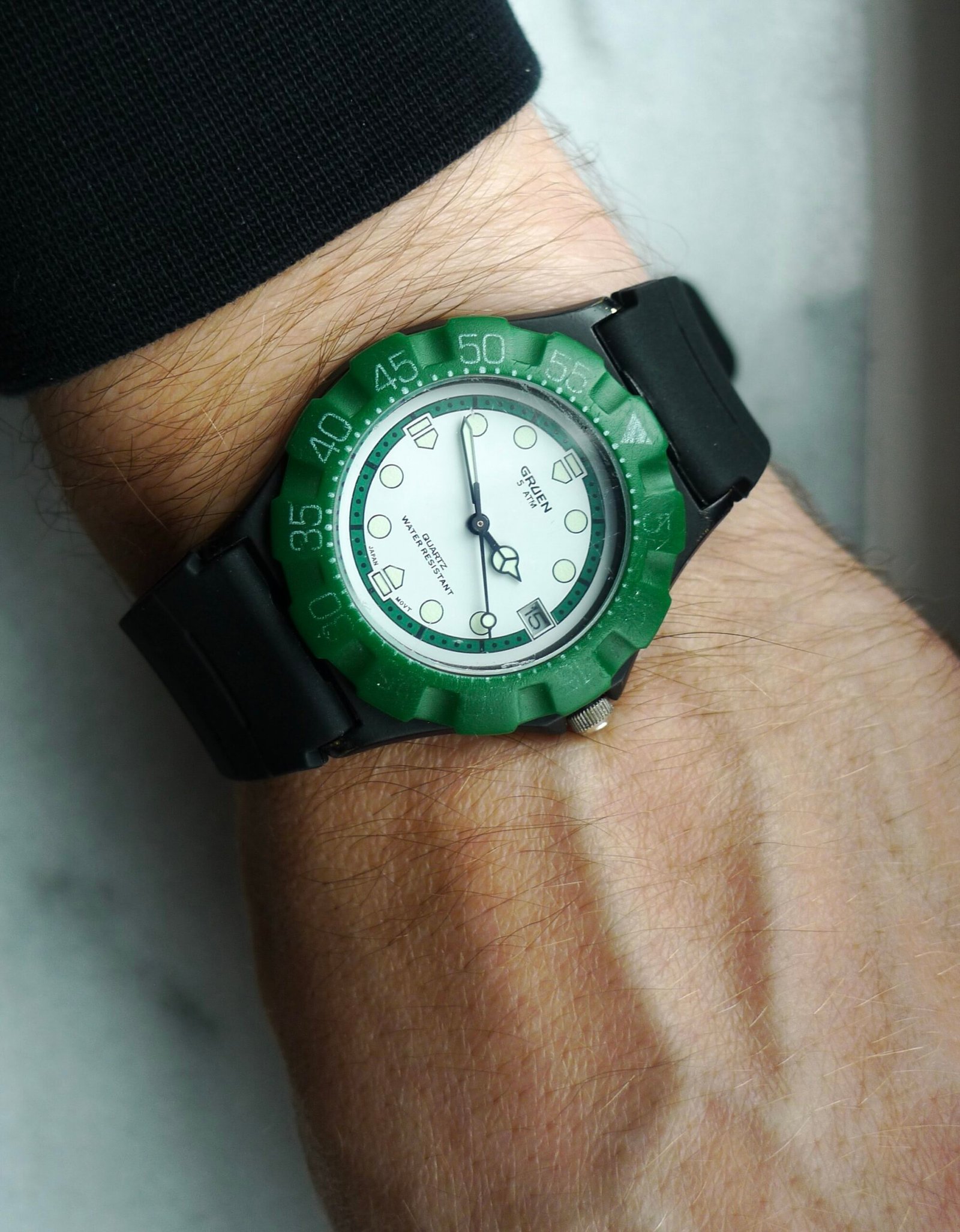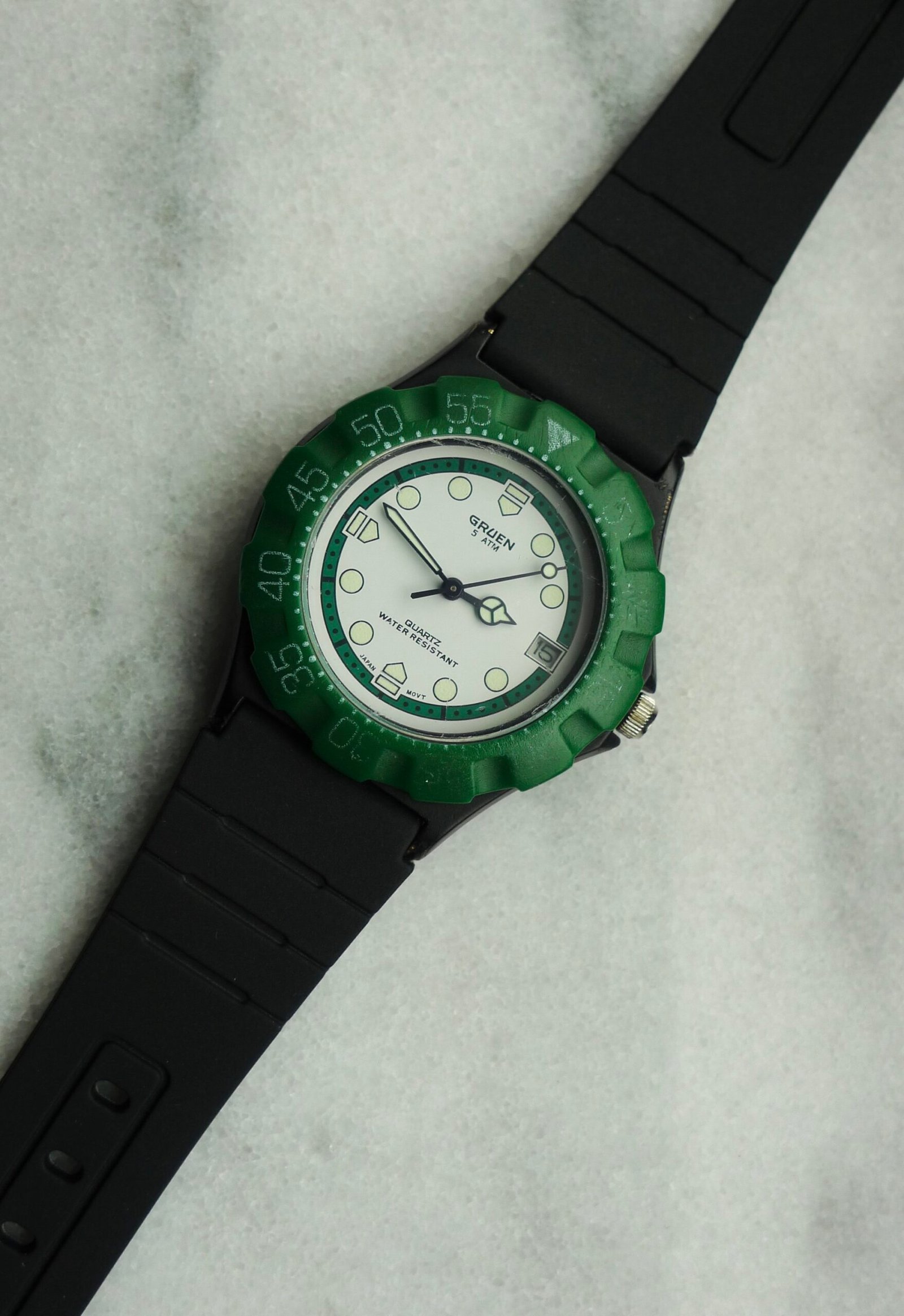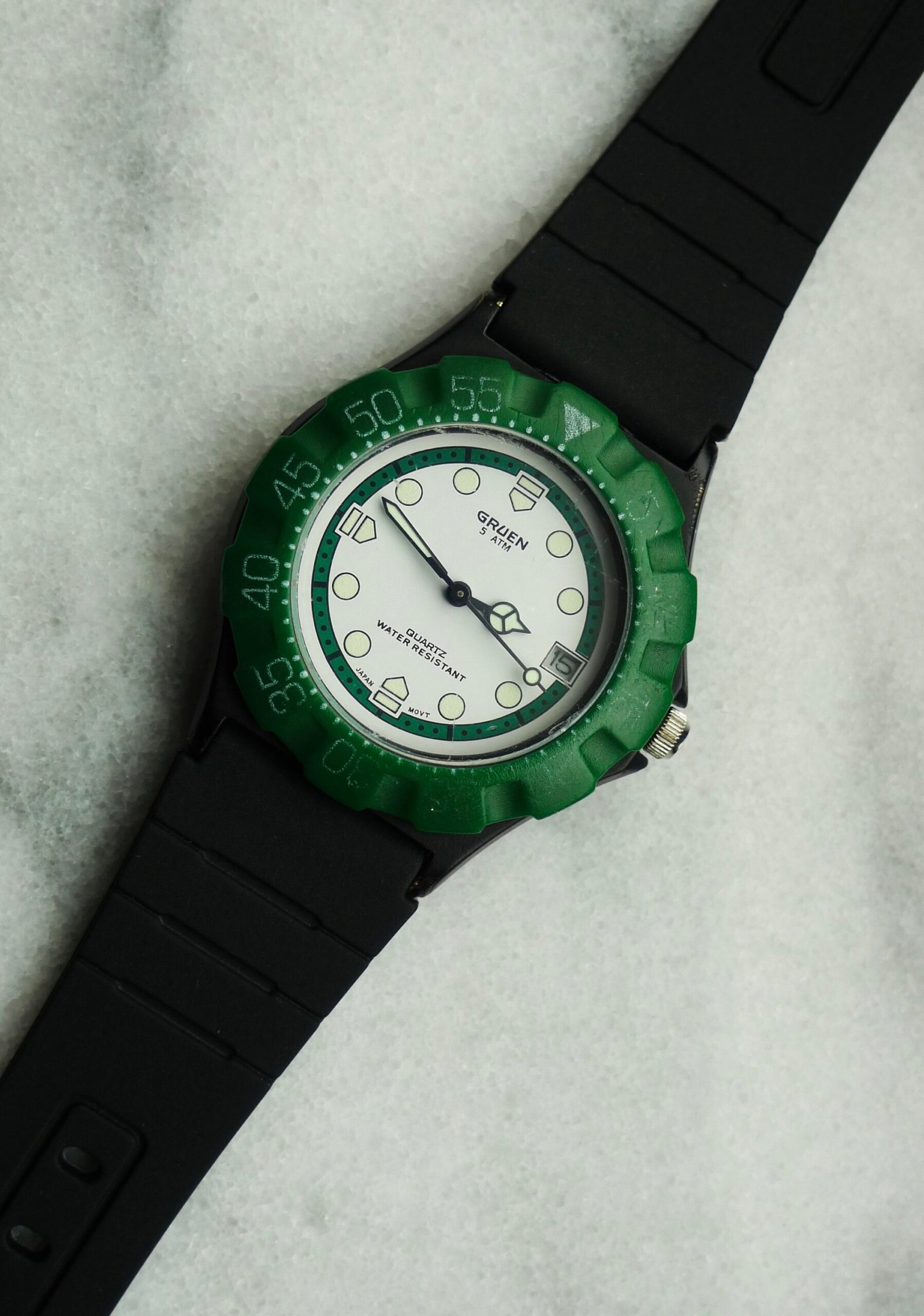 If you’re looking at this watch going, “wait, I’ve seen this before…except I haven’t…” then you’re in luck! That’s what pretty much everyone thinks! This is an uncommon vintage Gruen quartz watch in the style of the always popular TAG Heuer Formula One references. White dial, green bezel, black case. 90s/00s. 35 mm case, new battery, and ready to wear. Some marks/scuffs present on case and crystal. Replacement rubber strap. I always snag these when they pop up; when it comes to enjoyment-per-dollar, the Gruen F1 is tough to match.