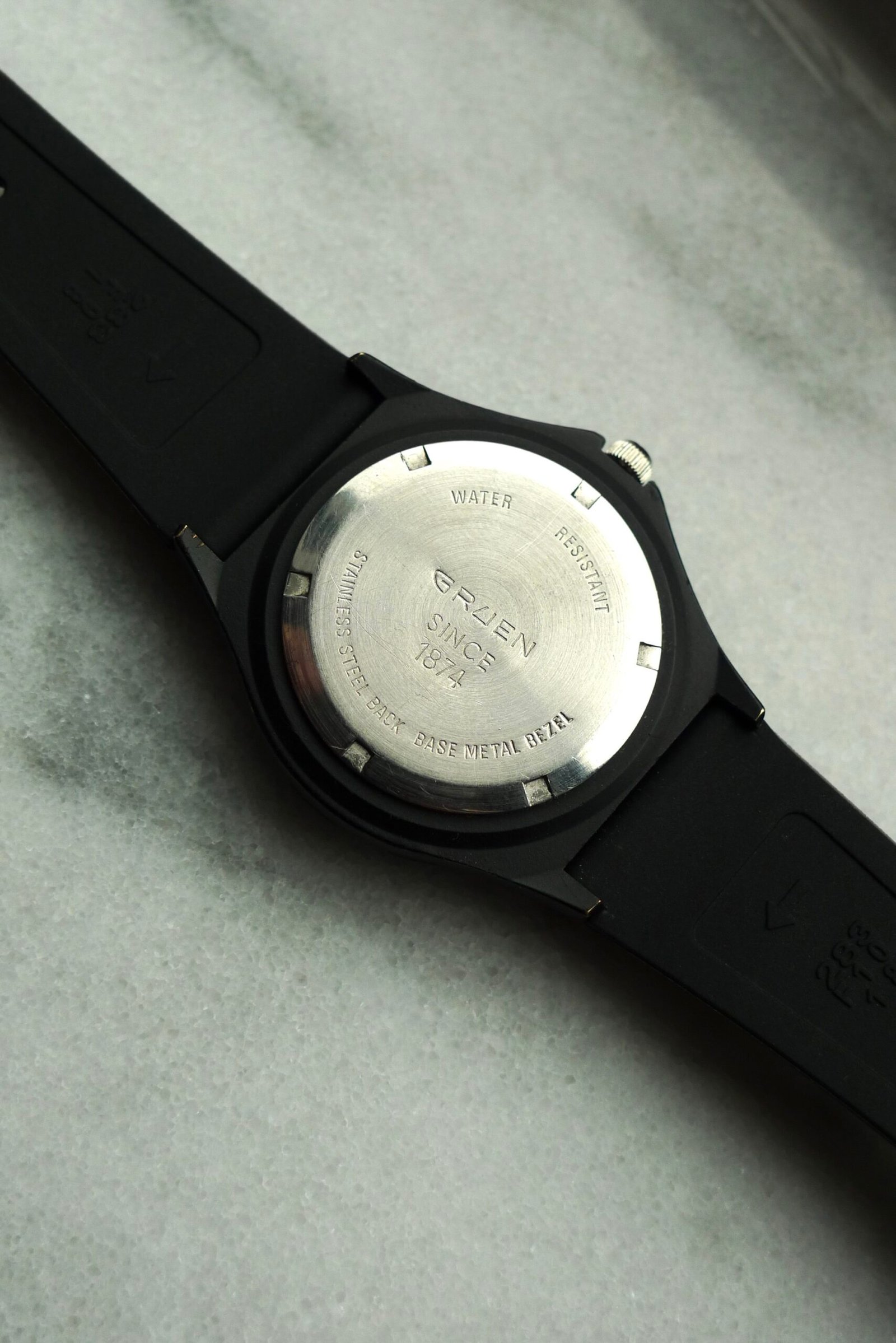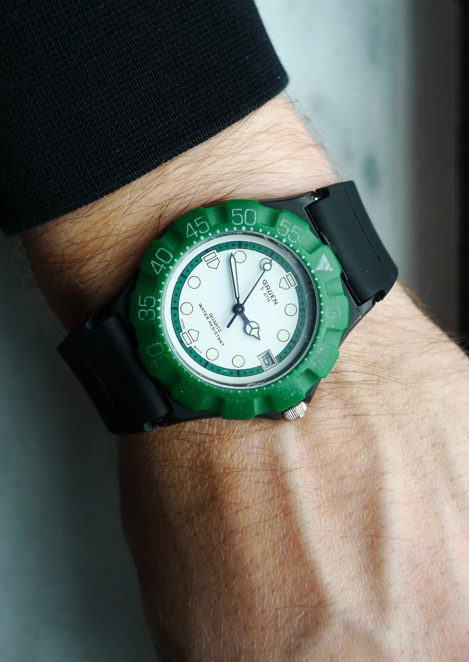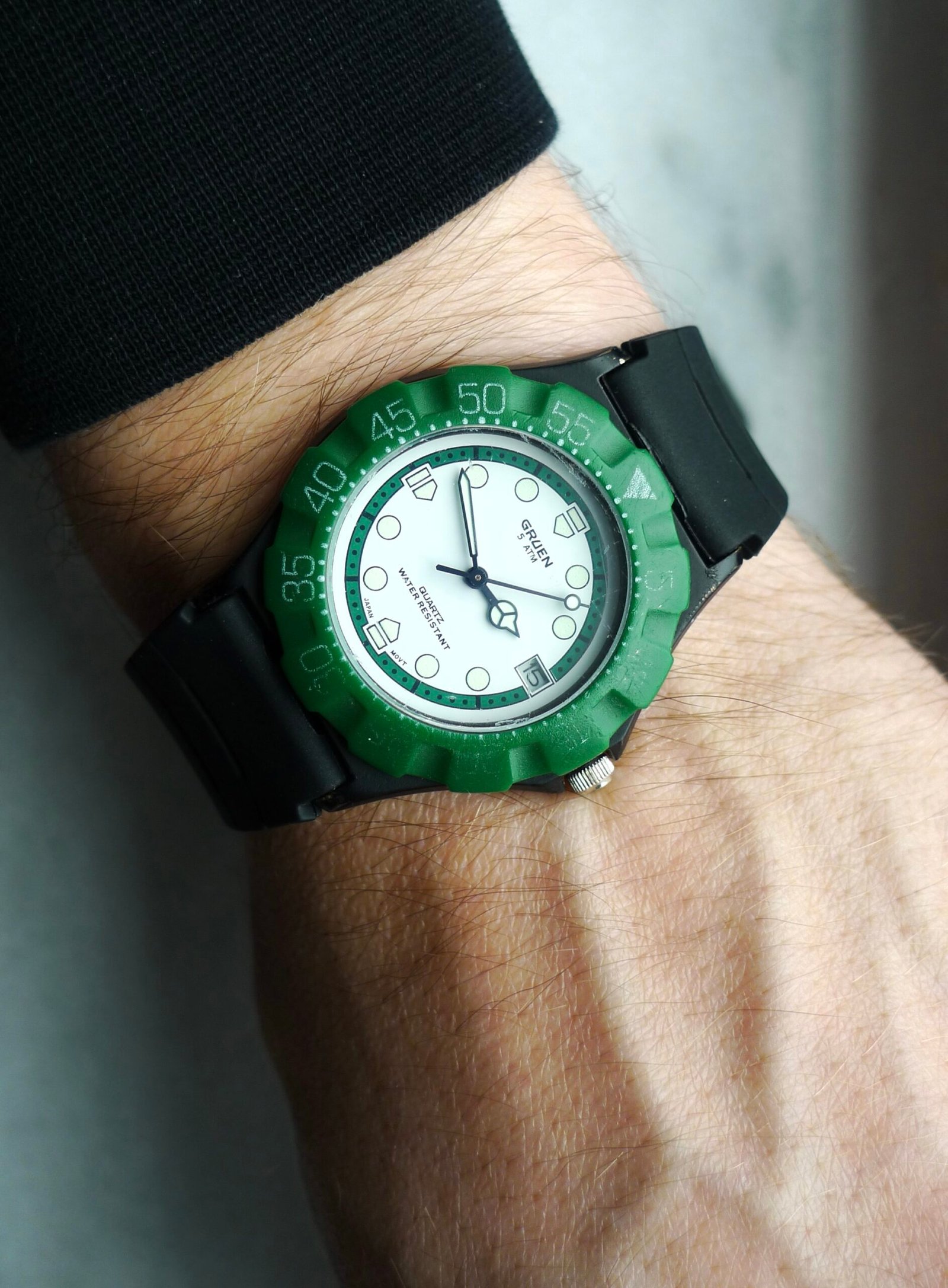 If you’re looking at this watch going, “wait, I’ve seen this before…except I haven’t…” then you’re in luck! That’s what pretty much everyone thinks! This is an uncommon vintage Gruen quartz watch in the style of the always popular TAG Heuer Formula One references. White dial, green bezel, black case. 90s/00s. 35 mm case, new battery, and ready to wear. Some marks/scuffs present on case and crystal. Replacement rubber strap. I always snag these when they pop up; when it comes to enjoyment-per-dollar, the Gruen F1 is tough to match.