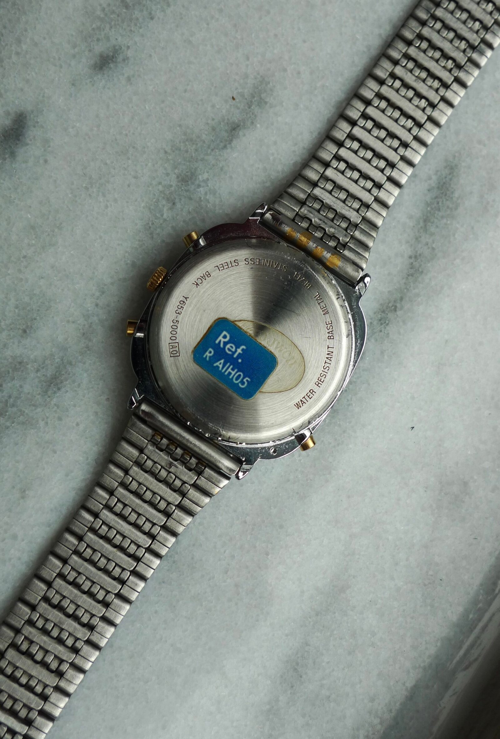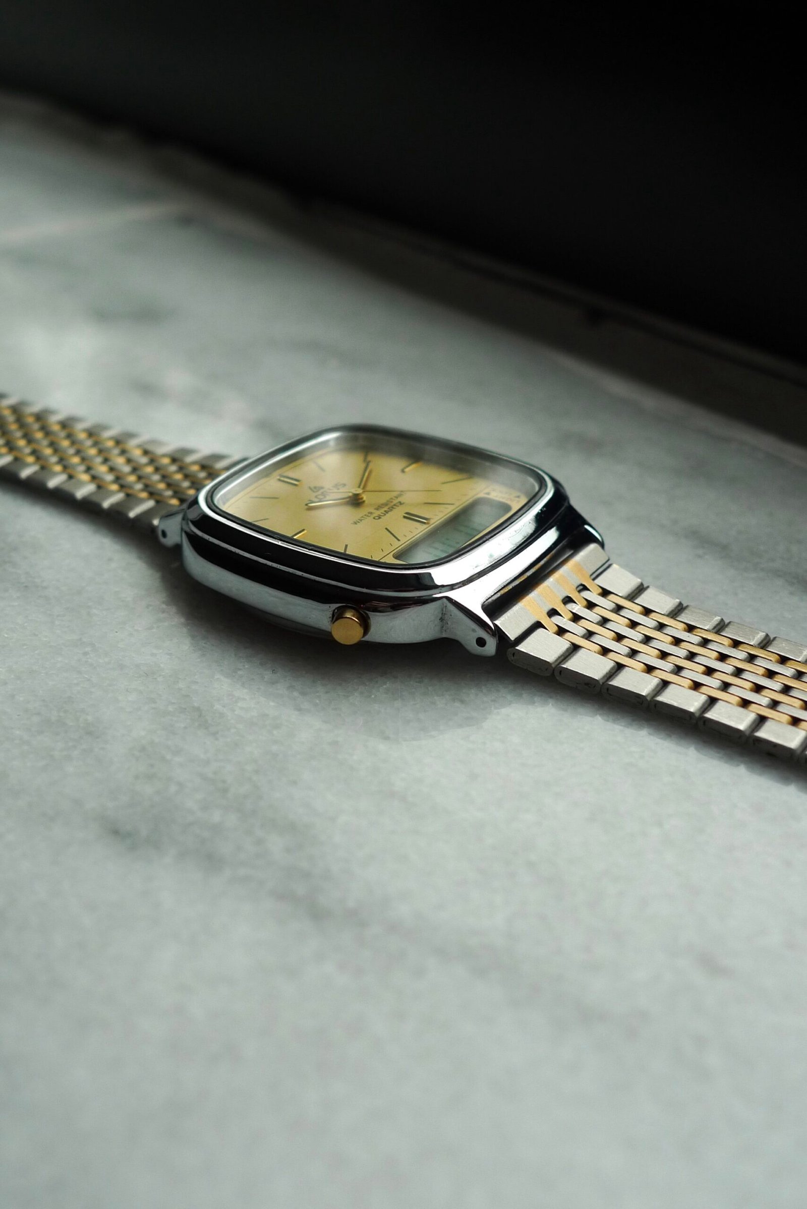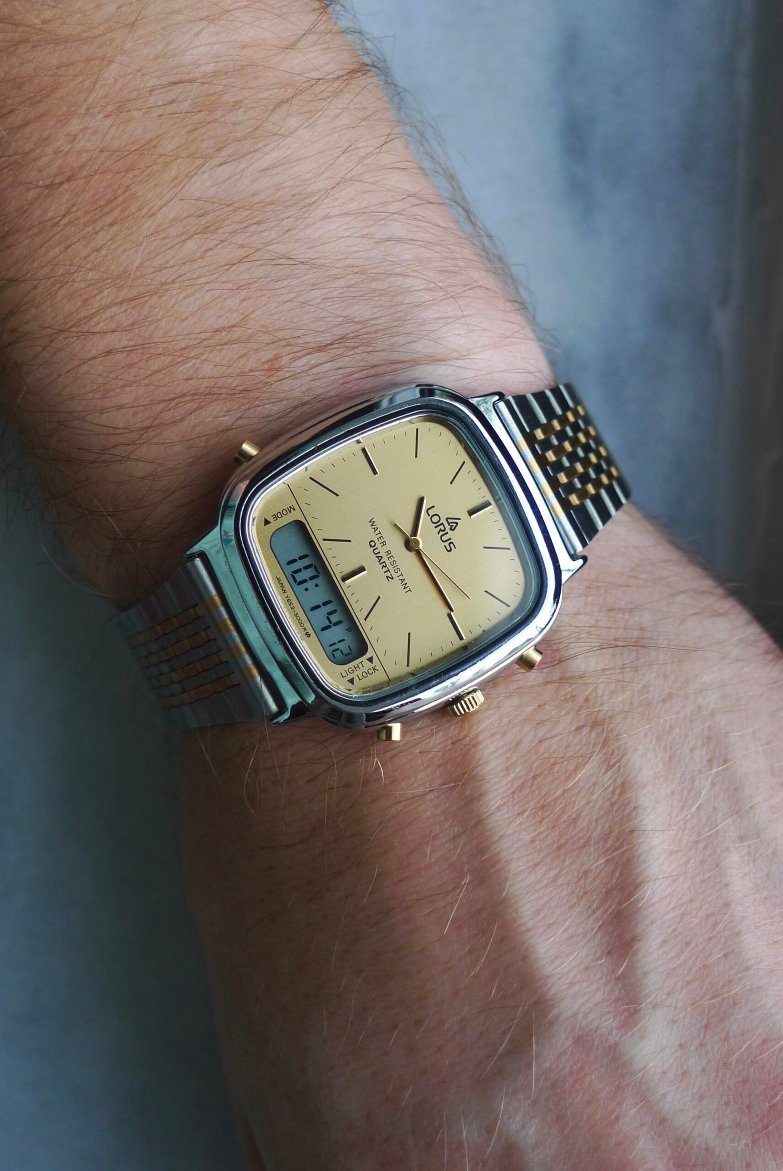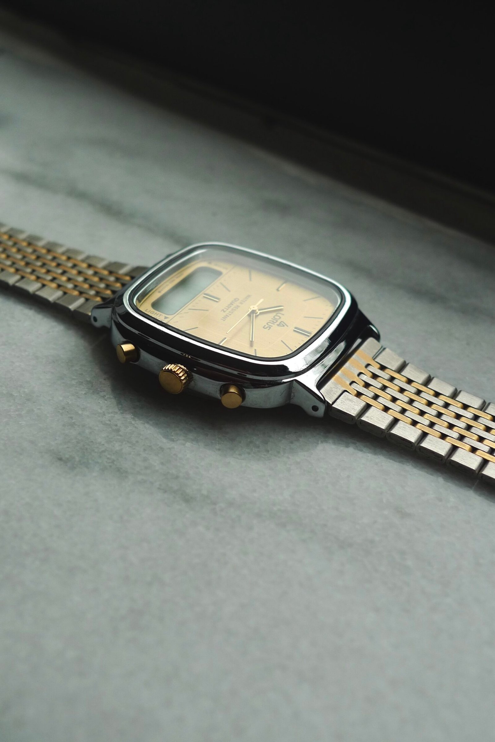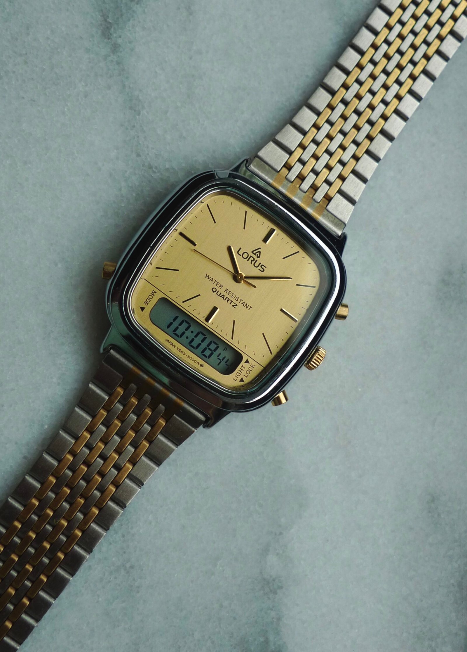 A super retro design in a two-tone, square, 32mm case. Lorus is a subset of Seiko and was often given license to play around with some of the quirkier designs; this watch definitely falls into that category. Light, pale yellow dial with gold tone pushers. All functions working and keeping great time. Bracelet is very adjustable and will fit a wide variety of wrist sizes, large and small.