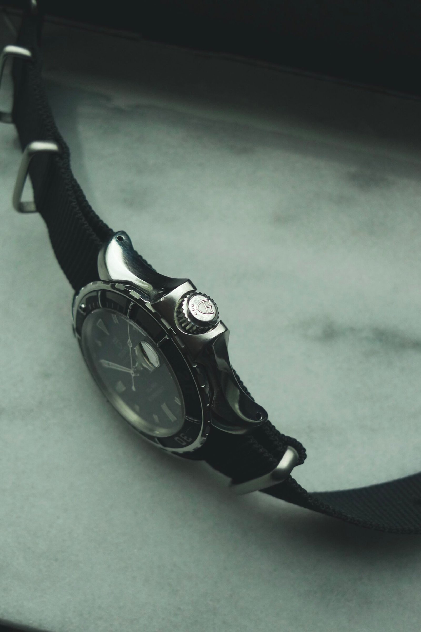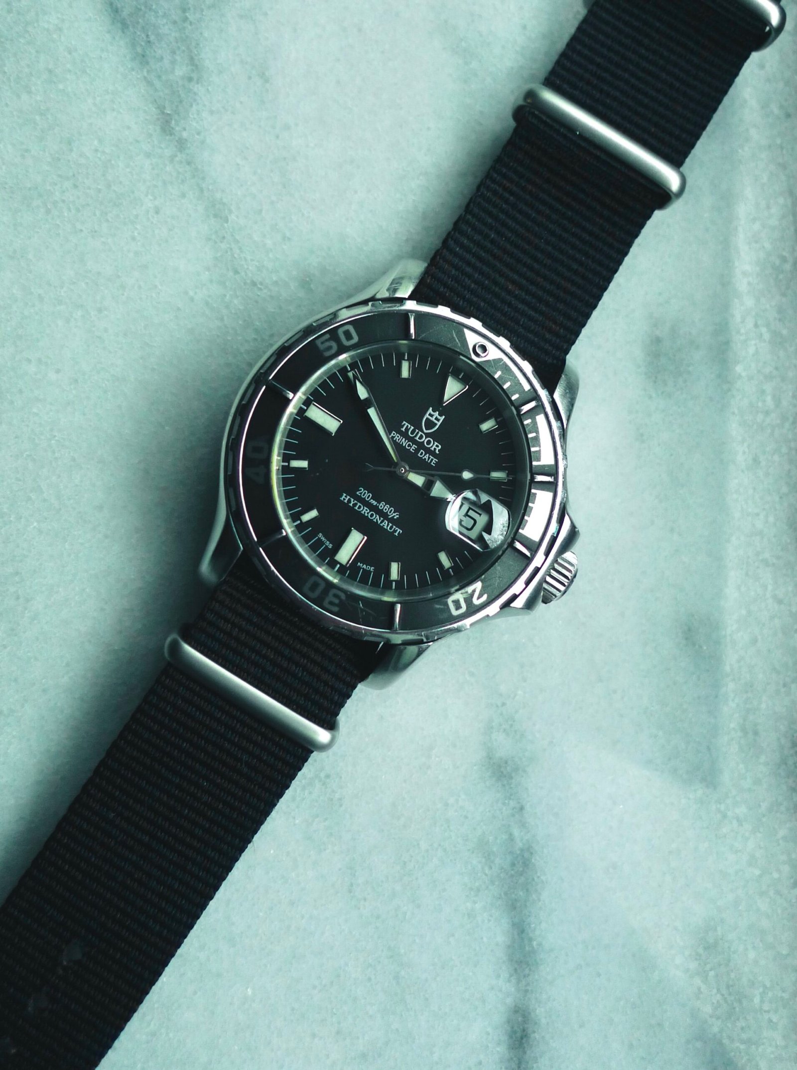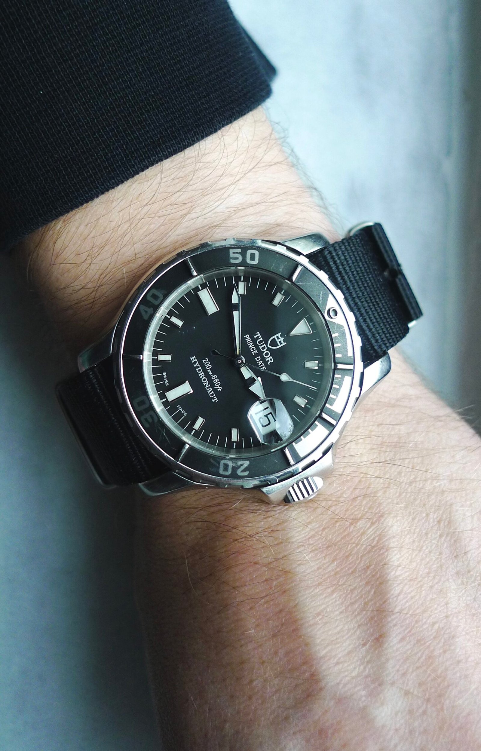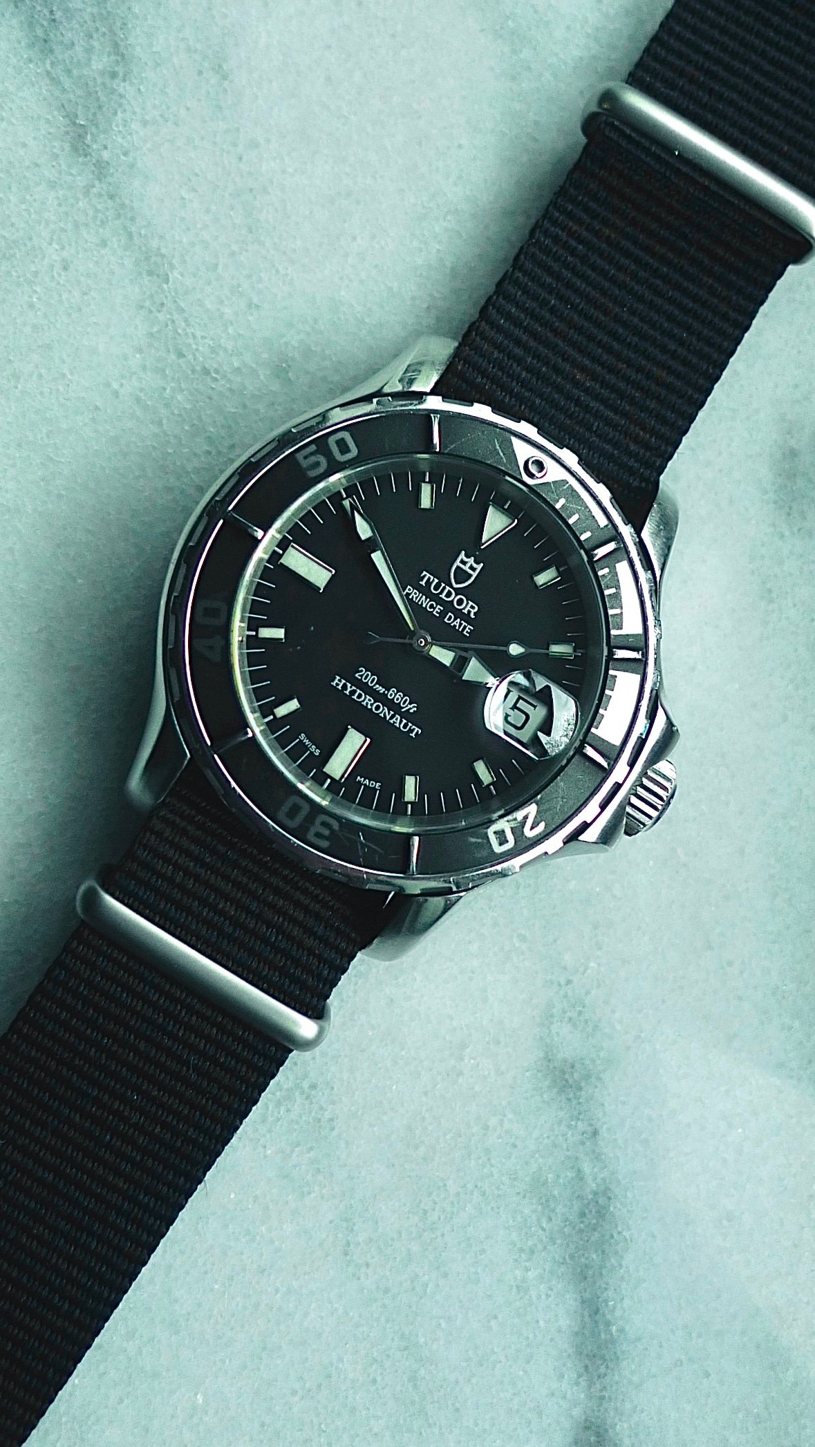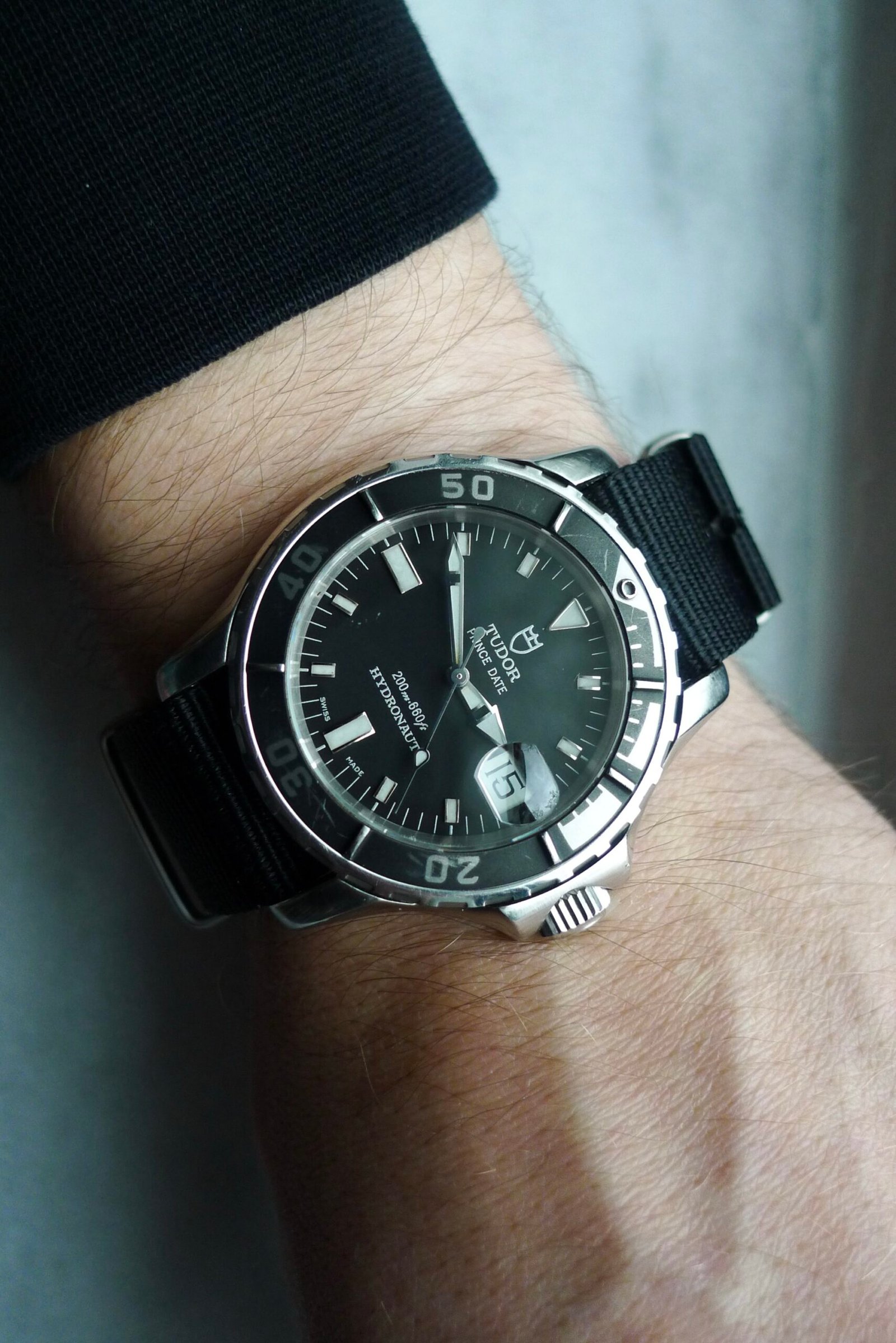 One of Tudor’s more out there dive watches, the Hydronaut really isn’t the prototypical Rolex/Tudor offering. That being said, visually speaking, it’s one of my favorites and one I find to be incredibly interesting. The case has enlarged lugs that act as guards for the bezel and crown; the bezel insert is a dark gray aluminum, with some scratching but otherwise fully intact. The case is approximately 41mm without the crown, 45mm with it. Crystal has a few small marks as shown in the photos. Watch winds, sets with no issue, and the quickset date changes easily. Currently keeping time within +/- 2 seconds per day. Lug width is 20mm; comes on a Hodinkee black nato strap.