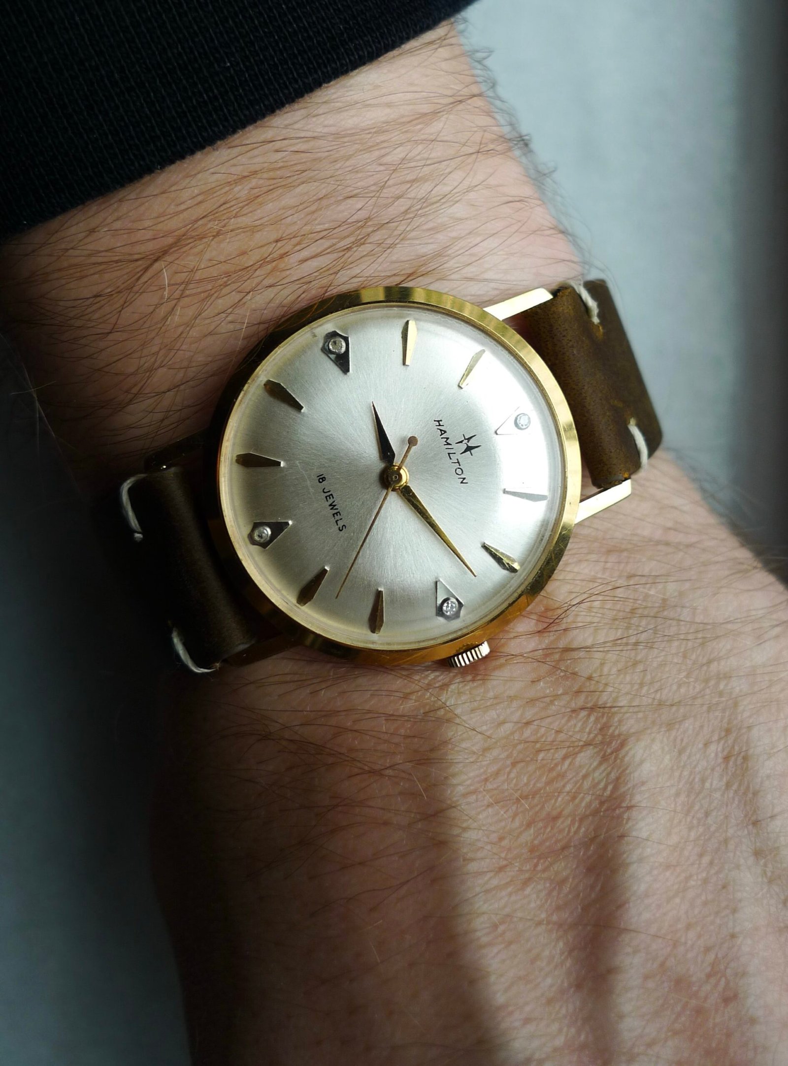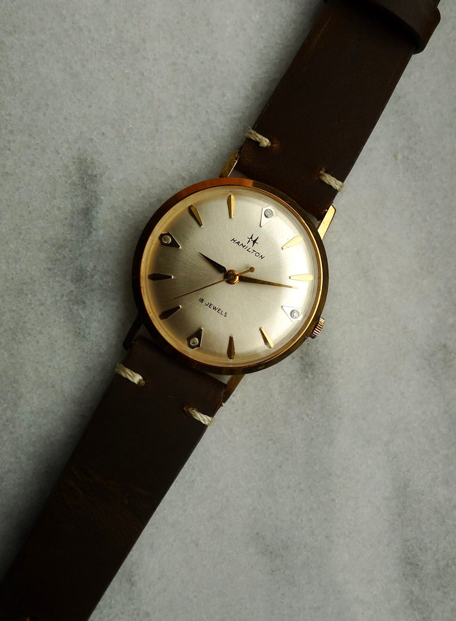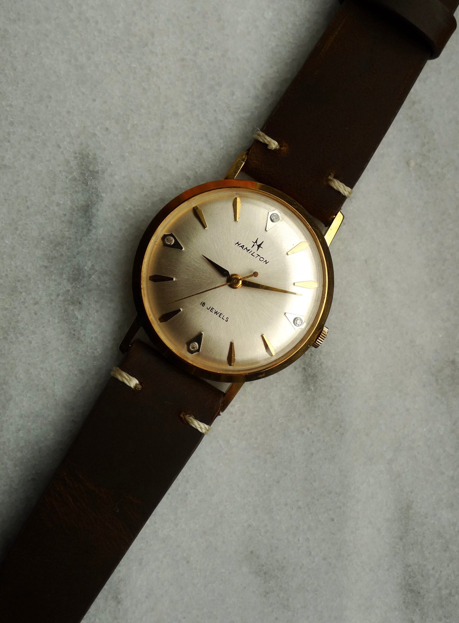 One of the last Hamilton watches made in Lancaster, PA. Movement is a cal 736 stamped “U.S.A.” 34mm case, 10k gold plated with diamond indices. Few unique features here: