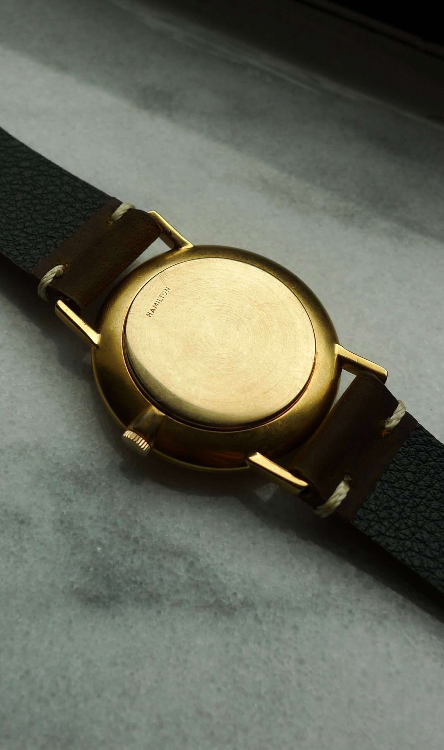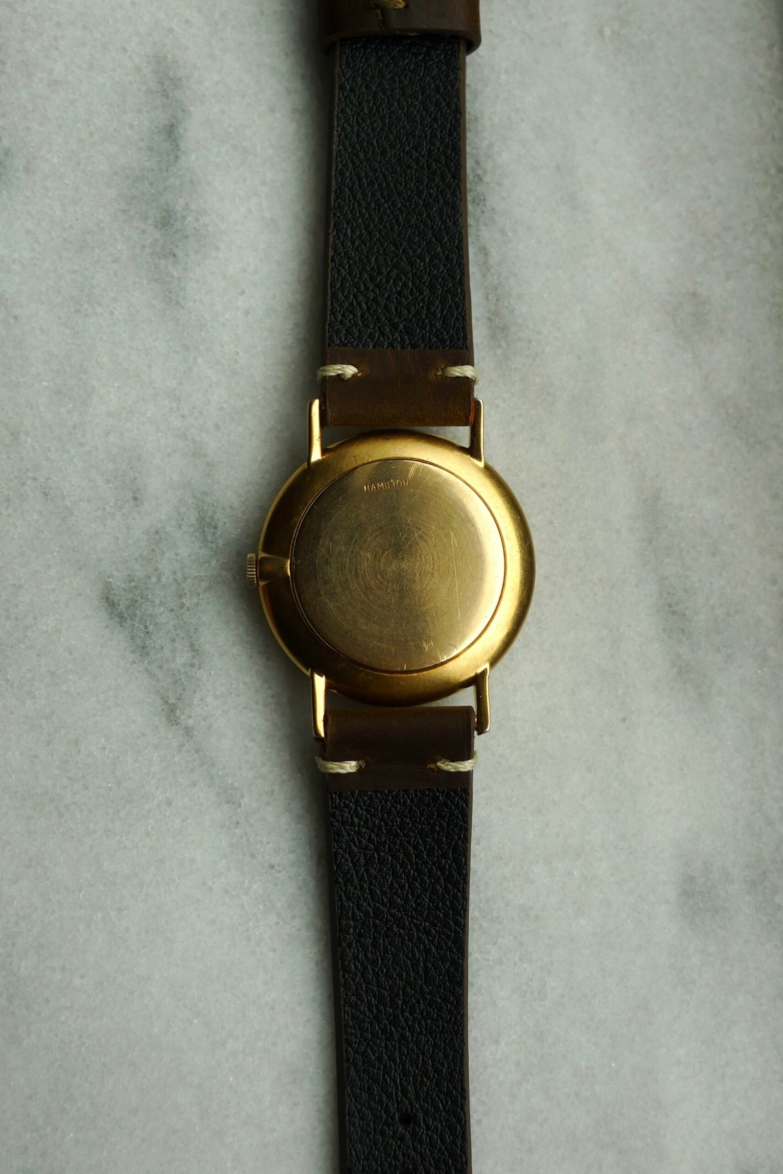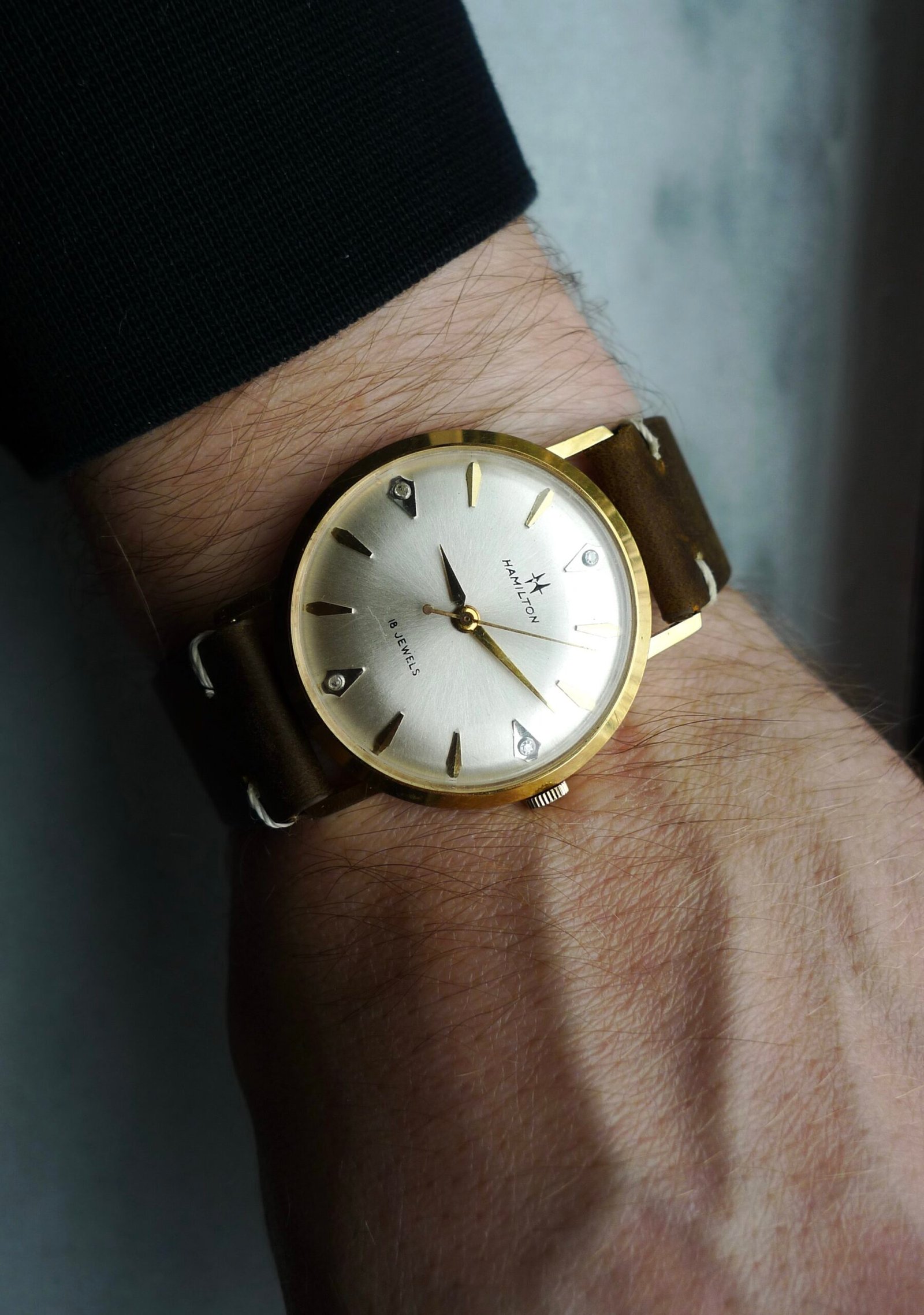 One of the last Hamilton watches made in Lancaster, PA. Movement is a cal 736 stamped “U.S.A.” 34mm case, 10k gold plated with diamond indices. Few unique features here: