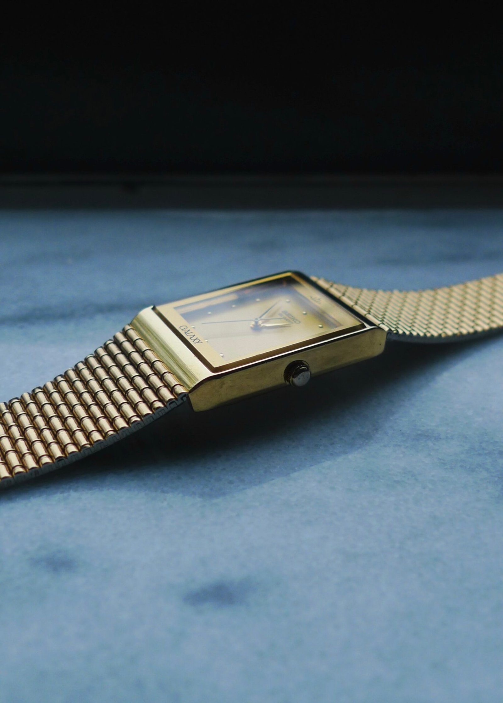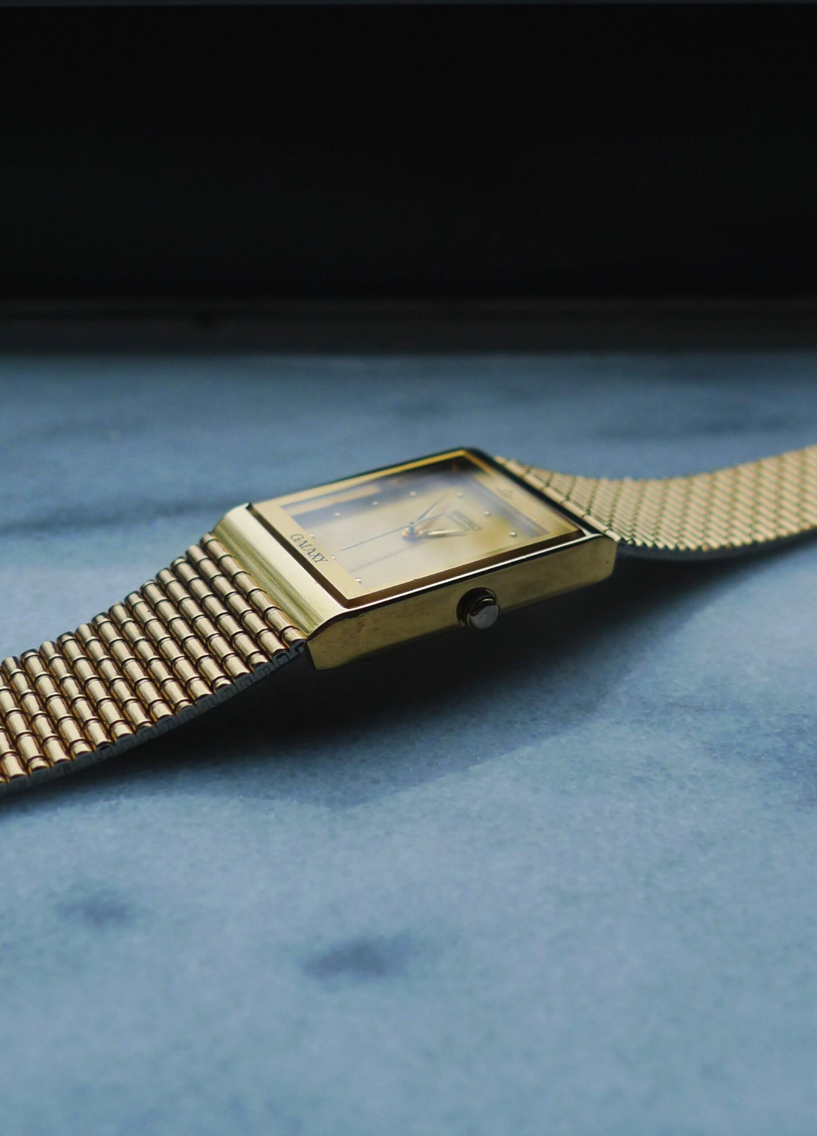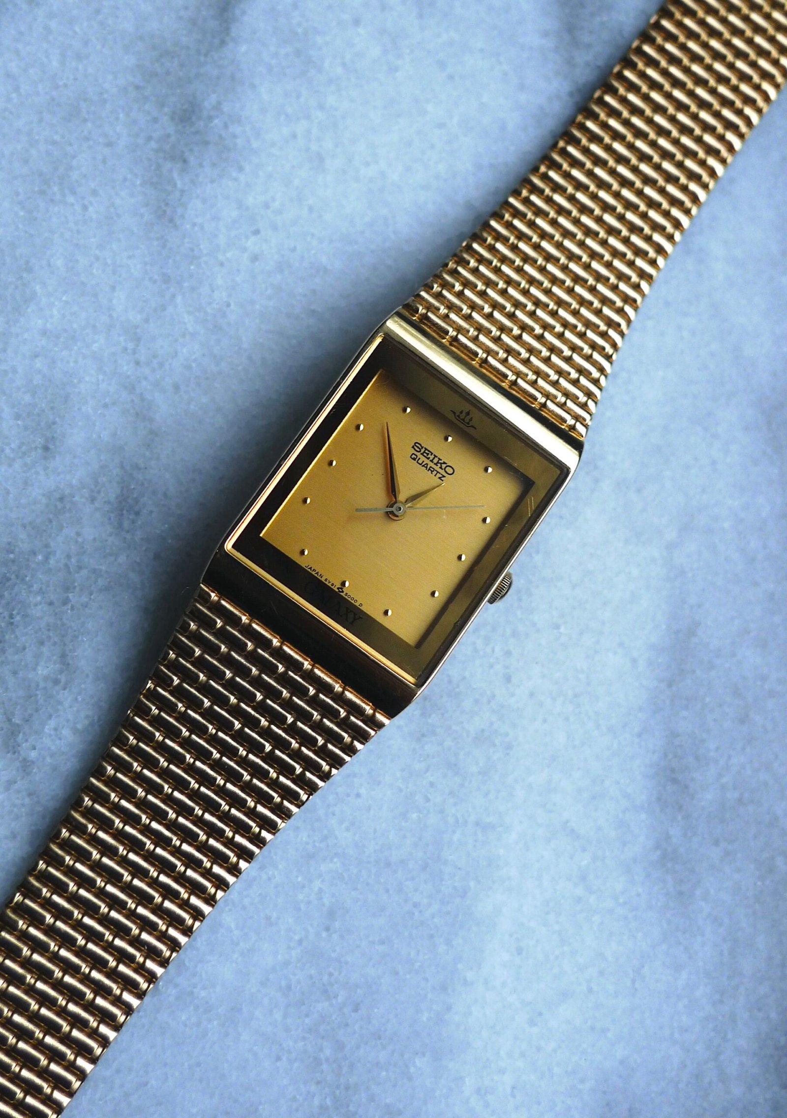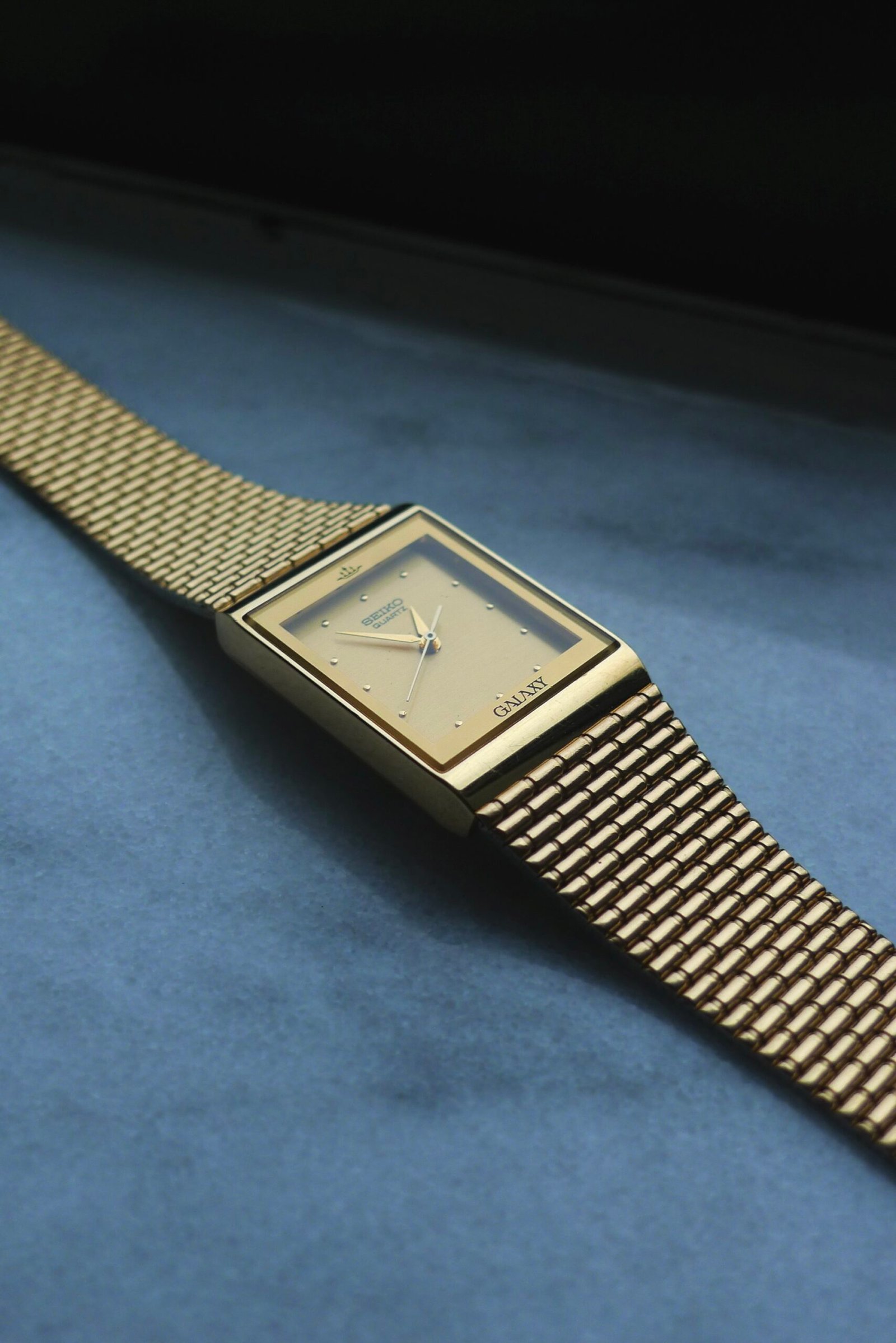 This Seiko Galaxy is golden toned piece of vintage class. Case is a modest 23×30 mm but wears slightly larger due to the bracelet integration. Bracelet is original Seiko in a bamboo configuration – incredibly comfortable and will fit a wide variety of wrist sizes. Quartz movement with a fresh battery. Light wear and minimal scratching: excellent condition for its age.