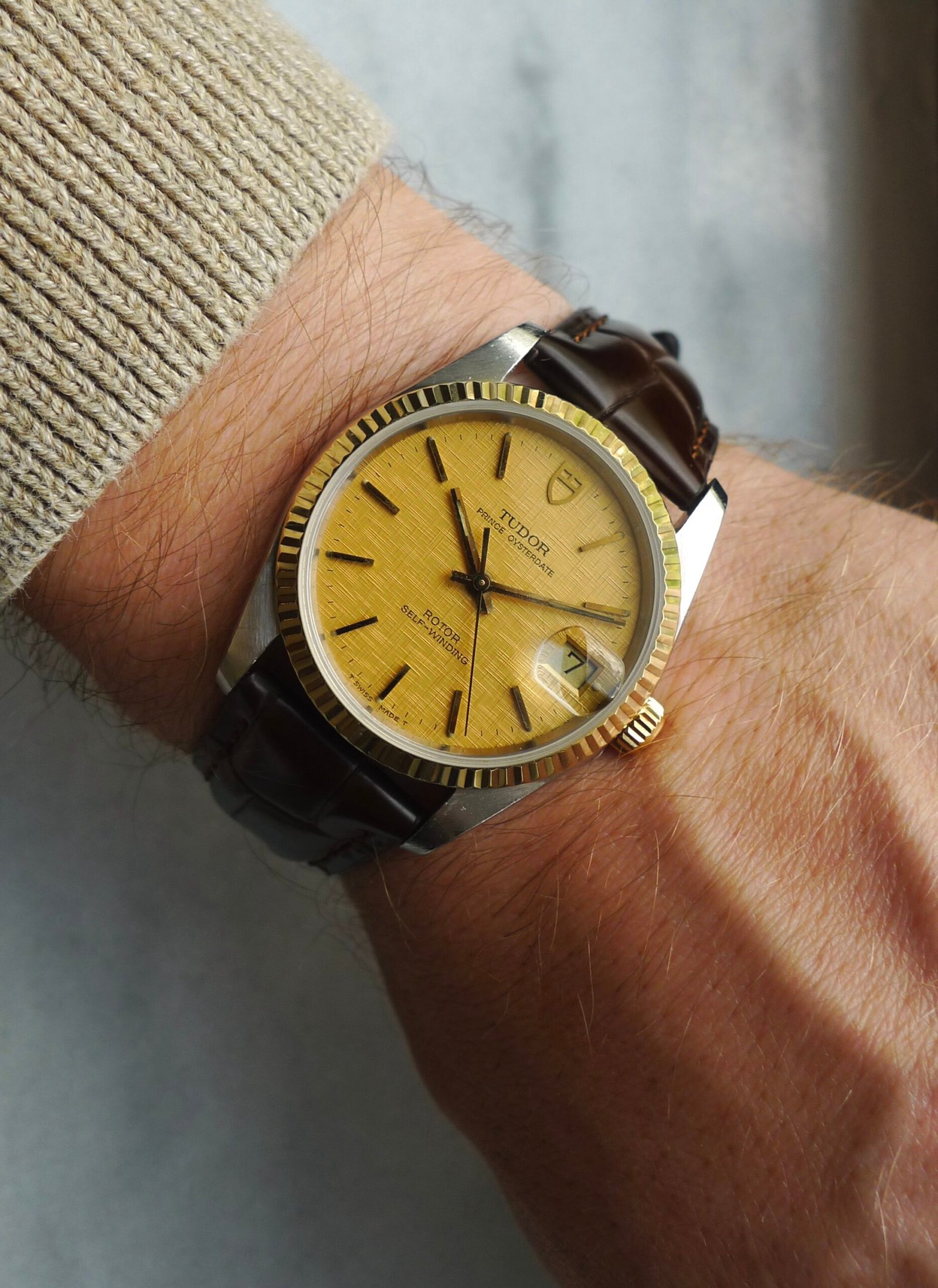A beautiful vintage Tudor Prince Oysterdate with a steel case, gold fluted bezel, and a textured linen dial that takes on the character of any type of lighting. 34mm case, 19mm lugs. Watch head is fully original and comes with original box and paper/guarantee: dated 1993. Strap is not original. Overall excellent condition with no marks on the crystal/cyclops and minimal wear present on the case; most significant wear is present under the lugs, as shown in photos. Winds and sets easily, quickset date function is crisp, and keeps excellent time.